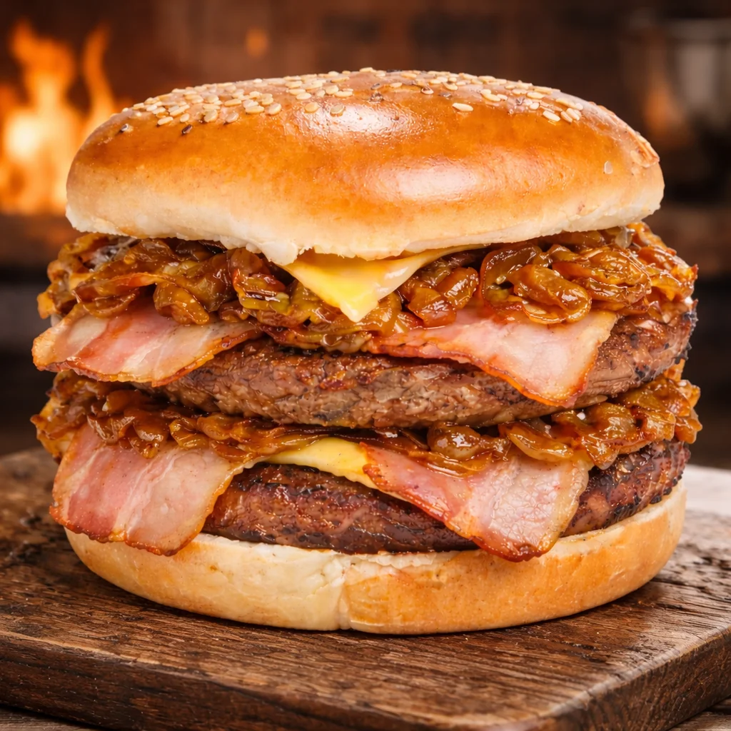 Una combinación brutal de doble carne de res a la parrilla, jugosa y perfectamente sellada, acompañada de doble queso cheddar derretido, tocino crocante y una generosa porción de cebolla caramelizada, que aporta un toque dulce y profundo irresistible.